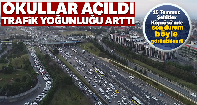 İstanbul’da yarı yıl tatilinden sonra okulların açıldığı ilk gün 15 Temmuz Şehitler Köprüsü’nde yoğun trafik oluştu. Özellikle Anadolu yakasından Avrupa’ya yoğun araç kuyruğu oluşurken, trafik havadan görüntülendi.