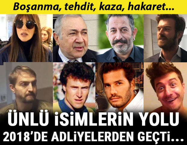 Müzik, sahne, spor ve podyum dünyasının tanınmış bazı isimleri 2018 yılında, çeşitli nedenlerle adliyelik oldu Futbolcu Arda Turan ile şarkıcı Berkay Şahin arasında, Emirgan’daki bir barda yaşanan ve Şahin’in burnunun kırılmasıyla sonuçlandığı belirtilen kavga davalık oldu Konuya ilişkin soruşturma başlatıp iddianame hazırlayan İstanbul Cumhuriyet Başsavcılığı, 30 Ocak’ta hakim karşısına çıkacak Turan hakkında 12,5 yıla kadar, Şahin hakkında da 2 yıla kadar hapis cezası talep etti Şarkıcı Sıla Gençoğlu, fiziksel şiddet gördüğünü iddia ettiği Ahmet Kural’dan şikayetçi oldu ve mahkemeden Kural’ın 3 ay süresince kendisine yaklaşmamasına yönelik koruma kararı aldırdı Ailenin Korunması ve Kadına Karşı Şiddetin Önlenmesi Bürosu savcısı tarafından 19 Aralık’ta hazırlanan iddianamede, şüpheli Kural’ın, ‘hakaret, tehdit ve kasten yaralama’ suçlarından 1 yıl 1 aydan 5 yıla kadar hapisle cezalandırılmasını talep edildi İddianameyi inceleyip kabul eden İstanbul 60. Asliye Ceza Mahkemesi, ilk duruşmanın 7 Mart 2019’da yapılmasını hükme bağladı Bir televizyon programında konuşan sanatçılar Metin Akpınar ve Müjdat Gezen hakkında İstanbul Anadolu Cumhuriyet Başsavcılığı tarafından 23 Aralık’ta soruşturma başlatıldı Müjdat Gezen’in, ‘Cumhurbaşkanına hakaret’, Metin Akpınar’ın ise ‘halkı hükümete karşı silahlı isyana tahrik’ ve ‘Cumhurbaşkanına hakaret’ suçlarından adli kontrol talebiyle sevk edildikleri mahkeme, 24 Aralık’ta Akpınar ve Gezen hakkında, ‘yurt dışına çıkış yasağı’ ve ‘haftada bir gün karakola imza vermek’ tedbirlerinin uygulanmasını kararlaştırdı Yönetmen Yılmaz Erdoğan ve oyuncu Belçim Bilgin Adalar Aile Mahkemesi’nde, televizyon programcısı Acun Ilıcalı ve Şeyma Subaşı da Silivri Aile Mahkemesi’ndeki tek celselik duruşmalarda anlaşmalı olarak boşandı