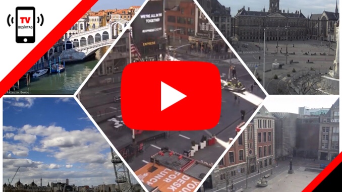 Koronavirüs sebebiyle Amsterdam, Venedik, New York, Singapur, Londra gibi dünyanın neredeyse tüm şehirleri ve meydanlar boş kaldı. İşte dünya şehirlerinin görüntülerini izleyebileceğiniz canlı yayınlar https://youtu.be/KGEekP1102g AMSTERDAM DAM SQUARE / HOLLANDA TIME SQUARE / NEW YORK – AMERİKA LONDON EYE / İNGİLTERE https://youtu.be/hBnhSxlL9So AMSTERDAM DAM SQUARE / HOLLANDA 2 VENEDİK / İTALYA https://youtu.be/14n5qs3oMv0 DOWNTOWN / SİNGAPUR https://youtu.be/_11BYUkE5Rk TOKYO / JAPONYA Yazı gezinmesi PTTAVM’den ÜCRETSİZ MASKE AÇIKLAMASIBDDK’dan FATİH PORTAKAL HAKKINDA SUÇ DUYURUSU
