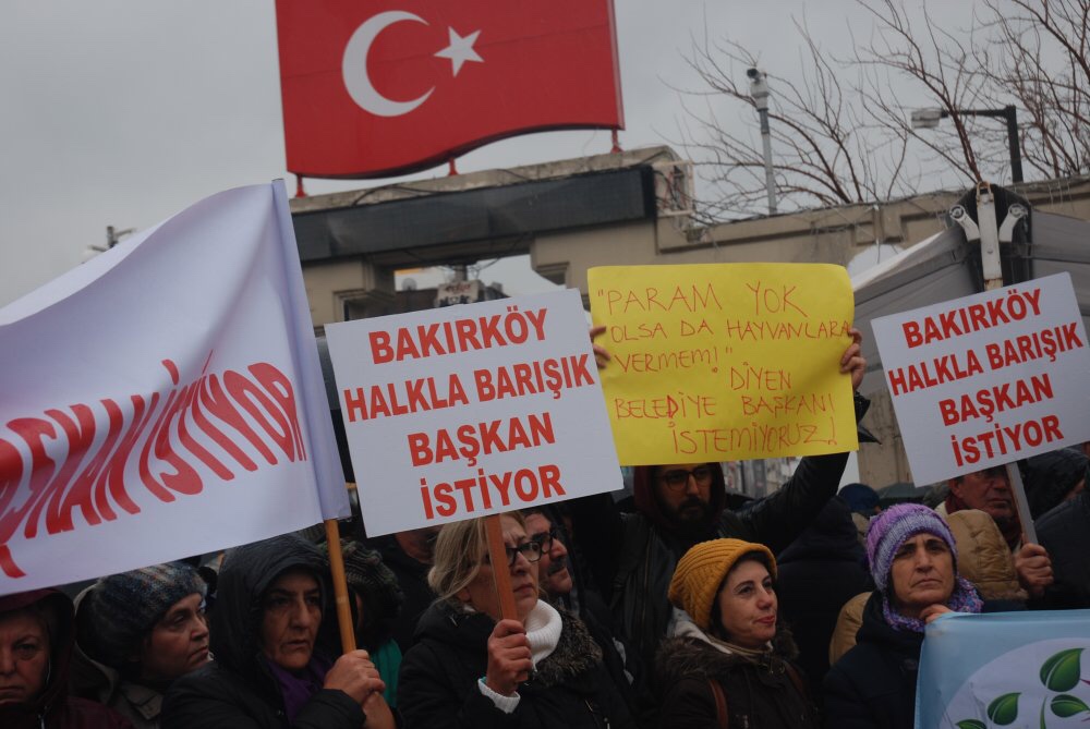 PARAM YOK OLSA DA HAYVANLARA VERMEM! diyen Belediye Başkanı istemiyoruz! yazılı döviz dikkat çekti.