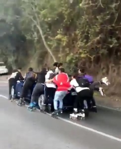 Beşiktaş Bebek Yokuşu’nda lüks bir otomobile tutunarak seyreden 11 patenli gencin tehlikeli yolculuğu kameralara yansıdı.