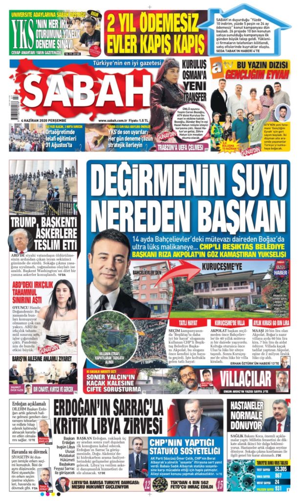 Sabah Gazetesi’nin ilk sayfasında, Rıza Akpolat’ın Bahçelievler’deki mütevazi evinden Boğaz manzaralı ve 60 bin lira kirası olan villaya geçişi ve eşine 2 milyonluk jip alması manşetten haber oldu.
