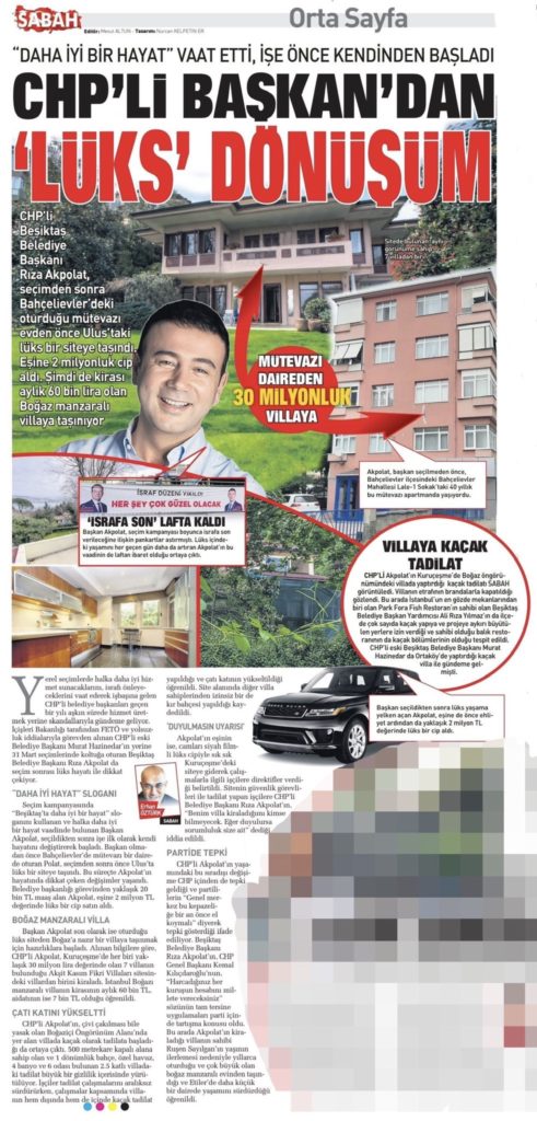CHP Genel Başkanı tarafından Bahçelievler’den getirilerek Beşiktaş’a Belediye Başkan adayı yapılan Rıza Akpolat’ın seçimlerden sonraki lüks yaşantısı bugün gazetelere ve haber sitelerine manşet oldu.