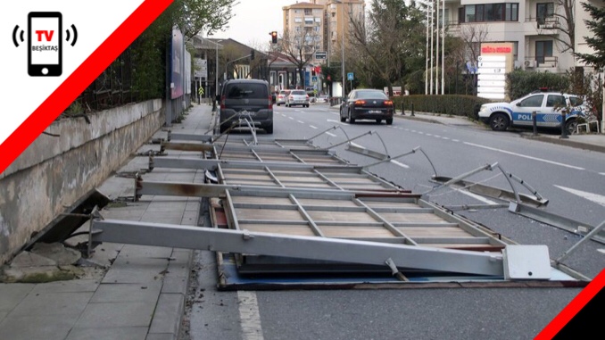 Beşiktaş’ta hissedilen şiddetli rüzgar Etiler Turizm Otelcilik arkasında kaldırım üzerinde bulunan Belediyenin dev reklam panosunu devirdi.