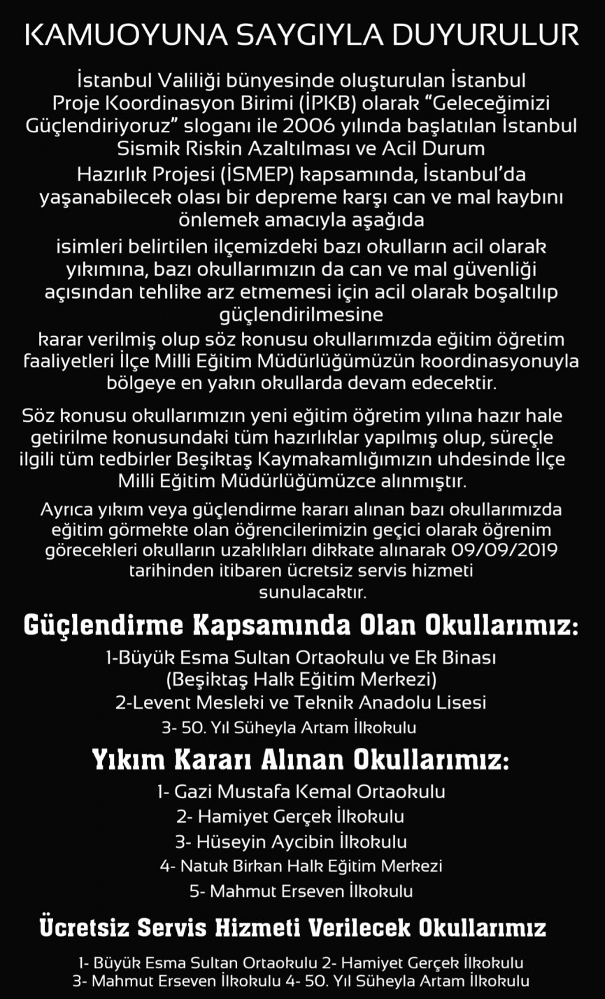 Söz konusu okullarımızın yeni eğitim öğretim yılına hazır hale getirilme konusundaki tüm hazırlıklar yapılmış olup, süreçle ilgili tüm tedbirler Beşiktaş Kaymakamlığımızın uhdesinde İlçe Milli Eğitim Müdürlüğümüzce alınmıştır. Ayrıca yıkım veya güçlendirme kararı alınan bazı okullarımızda eğitim görmekte olan öğrencilerimizin geçici olarak öğrenim görecekleri okulların uzaklıkları dikkate alınarak 09/09/2019 tarihinden itibaren ücretsiz servis hizmeti sunulacaktır. Kamuoyuna saygıyla duyurulur.
