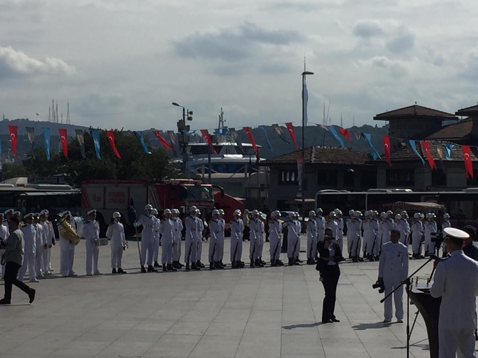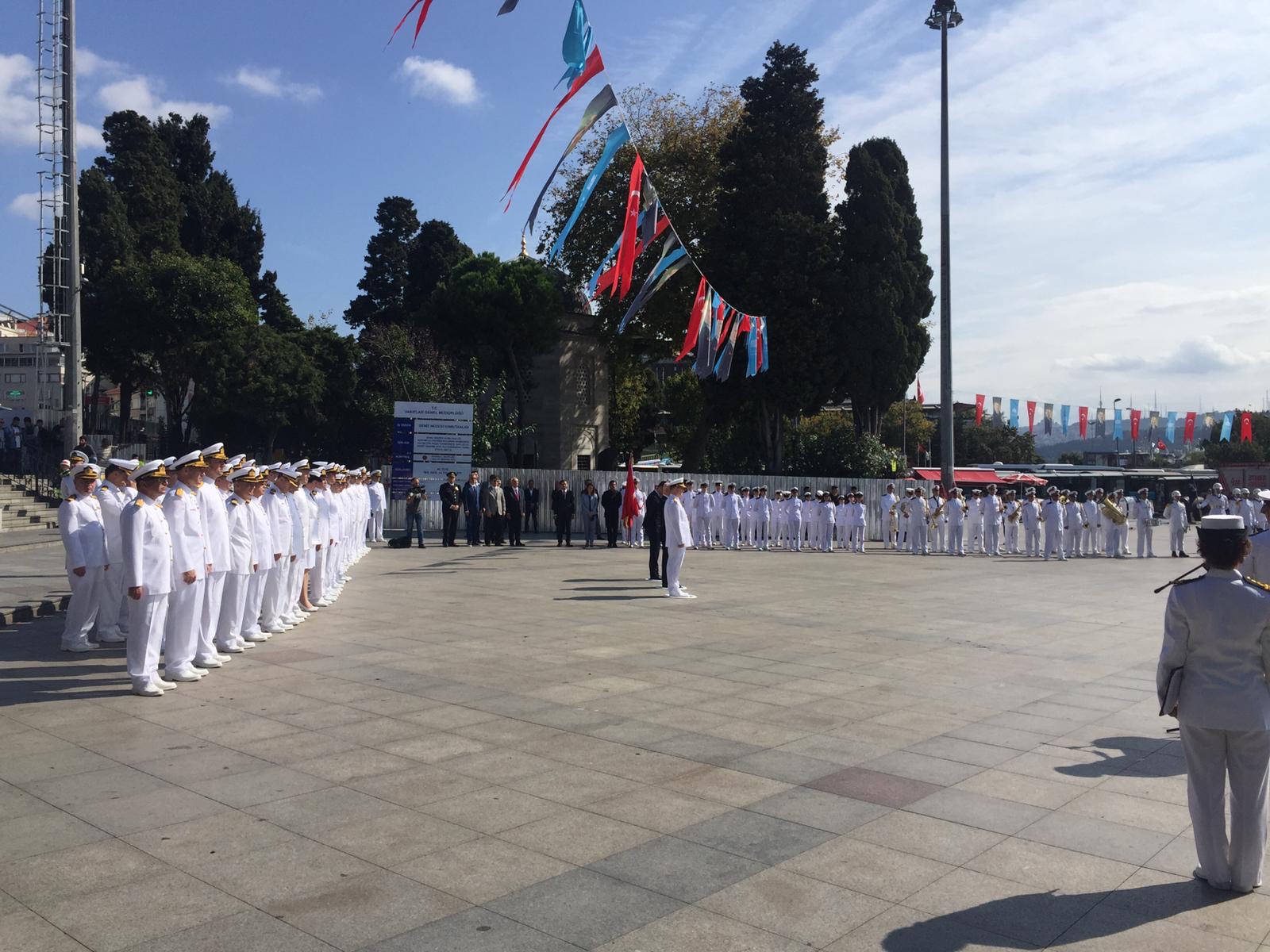 Barbaros Hayrettin Paşa Anıtı’na çelenk konulması, sancağın silistre eşliğinde toka edilmesiyle başladı. Saygı duruşu ve tören mangasının saygı atışından sonra İstiklal Marşı okundu.