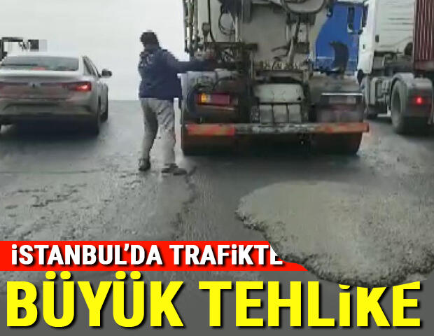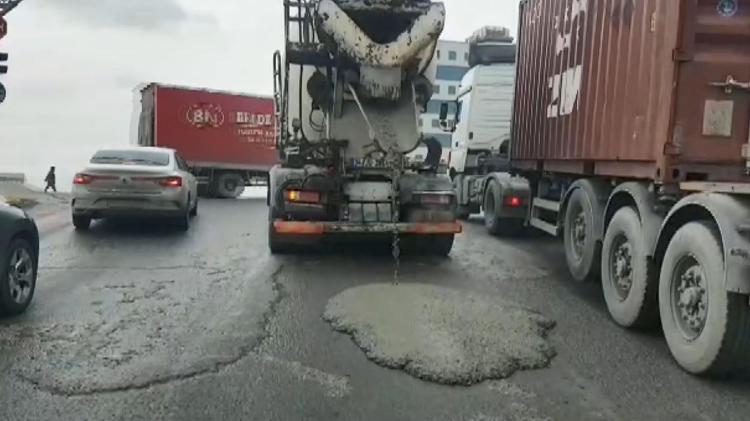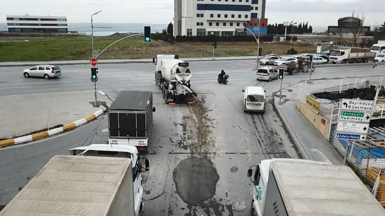 ESENYURT’ta fazla yükleme yapan beton mikserlerinin yola beton dökmesi kameraya yansıdı.