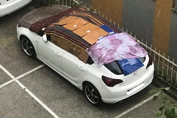 Bazı vatandaşlar dolu yağışına karşı araçlarının üzerini kilim ve kartonlarla kapatarak önlem almaya çalıştı.