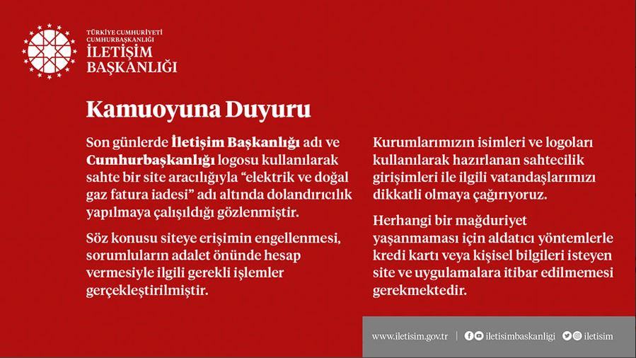 “Son günlerde İletişim Başkanlığı adı ve Cumhurbaşkanlığı logosu kullanılarak sahte bir site aracılığıyla ‘elektrik ve doğal gaz fatura iadesi’ adı altında dolandırıcılık yapılmaya çalışıldığı gözlenmiştir. Söz konusu siteye erişimin engellenmesi, sorumluların adalet önünde hesap vermesiyle ilgili gerekli işlemler gerçekleştirilmiştir. Kurumlarımızın isimleri ve logoları kullanılarak hazırlanan sahtecilik girişimleriyle ilgili vatandaşlarımızı dikkatli olmaya çağırıyoruz. Herhangi bir mağduriyet yaşanmaması için aldatıcı yöntemlerle kredi kartı veya kişisel bilgileri isteyen site ve uygulamalara itibar edilmemesi gerekmektedir.”
