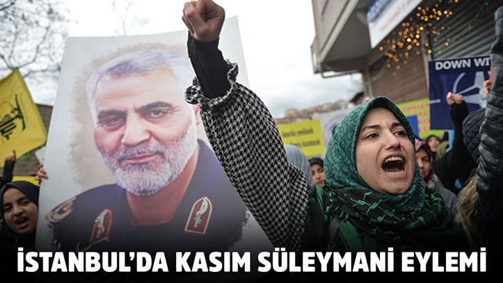 Ellerinde Süleymani’nin fotoğraflarının basılı olduğu pankartlar taşıyan grup, ABD aleyhinde slogan attı. Polisin yoğun güvenlik önlemi altında gerçekleşen eyleme kadınlar da katıldı. Bir süre slogan atan grup, olaysız şekilde dağıldı.