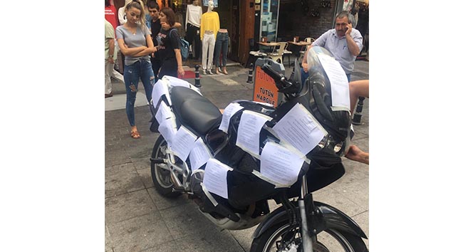 Olay, Kadıköy’de trafiğe kapalı olarak bulunan Serasker Caddesi üzerinde yaşandı. Motosikletini sürekli cadde üzerinde bulunan esnafın dükkanlarının önüne park eden sürücü sonunda esnafı bezdirdi. Motosikletin yapılan uyarılardan sonra yine aynı şekilde park edildiğini gören cadde esnafının, bu kez verdiği tepki gülümsetti. Motosikletin dört bir tarafını A4 kağıtları ile kapatan esnaf, bütün kağıtların üzerine aynı notu yazdı. Esnaf bununla da yetinmeyerek motosikleti park edilen yerden kaldırarak başka yere koydu.
