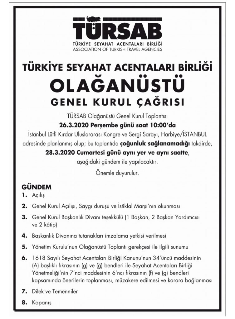 Merkezi Beşiktaş’ta bulunan Türkiye Seyahat Acenteleri Birliği olağanüstü genel kurul duyurusu yaptı.