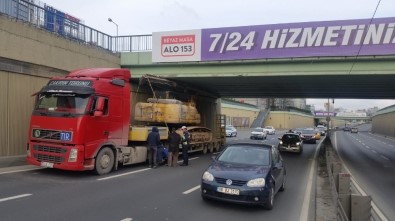 Seyrantepe’de iş makinesi taşıyan bir tır, yüksekliği hesaplayamayınca üst geçide takılarak sıkıştı. Ekiplerin uzun uğraşları sonucunda tırın lastikleri indirilerek sıkıştığı yerden kurtarıldı.